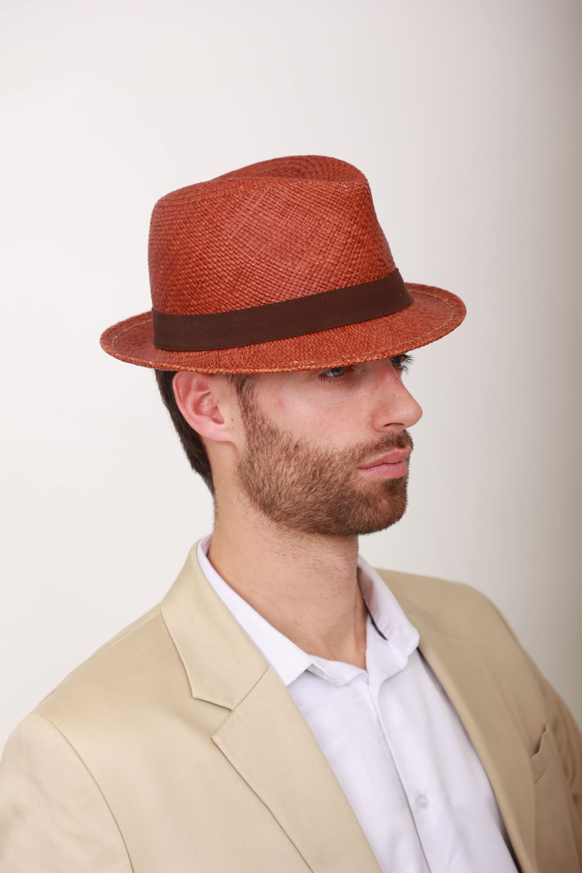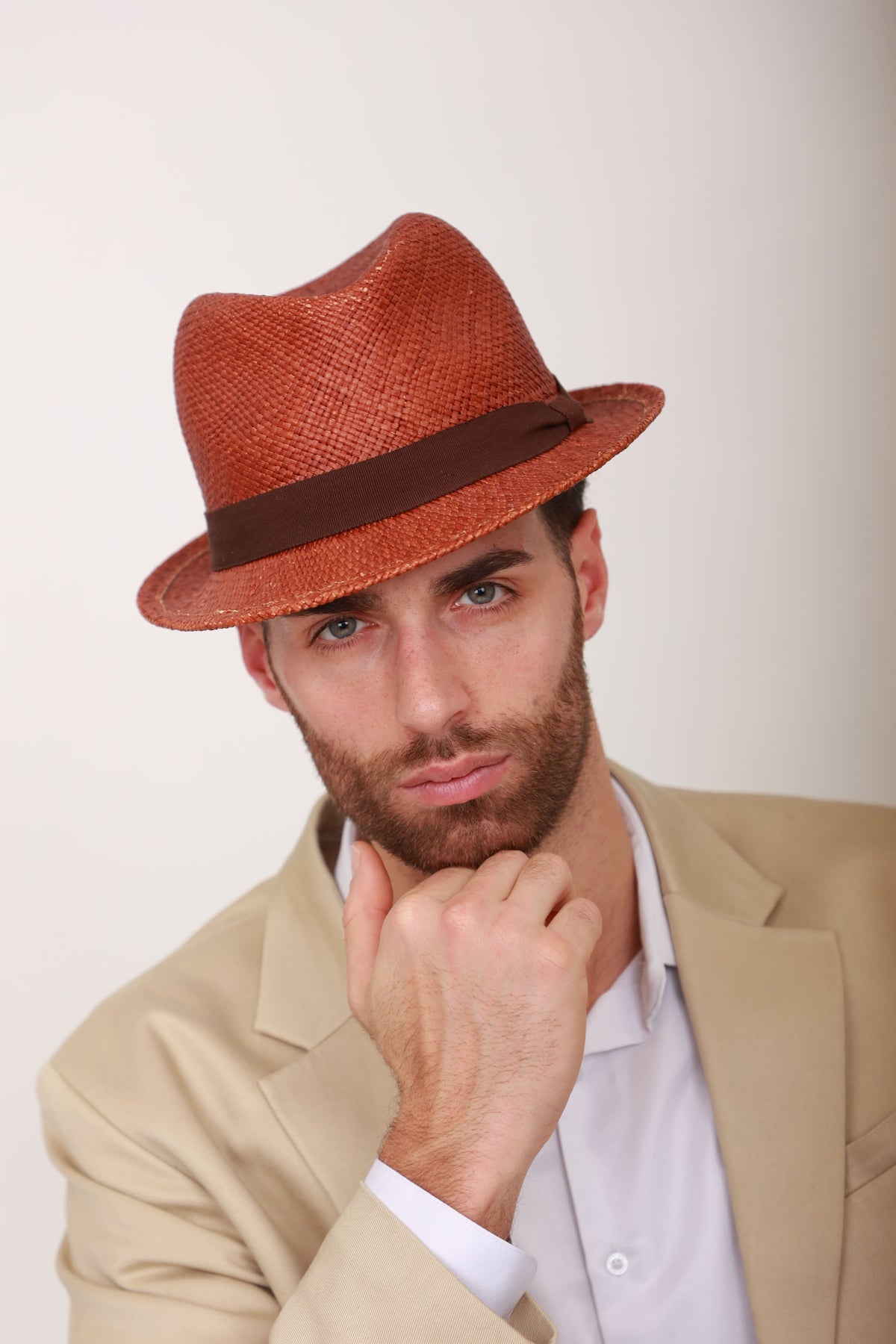 Description : Élégant et affirmé, ce trilby en panama couleur rouille est sublimé par un ruban noir. Un modèle masculin au style intemporel, parfait pour apporter caractère et distinction à vos tenues. Pièce unique.