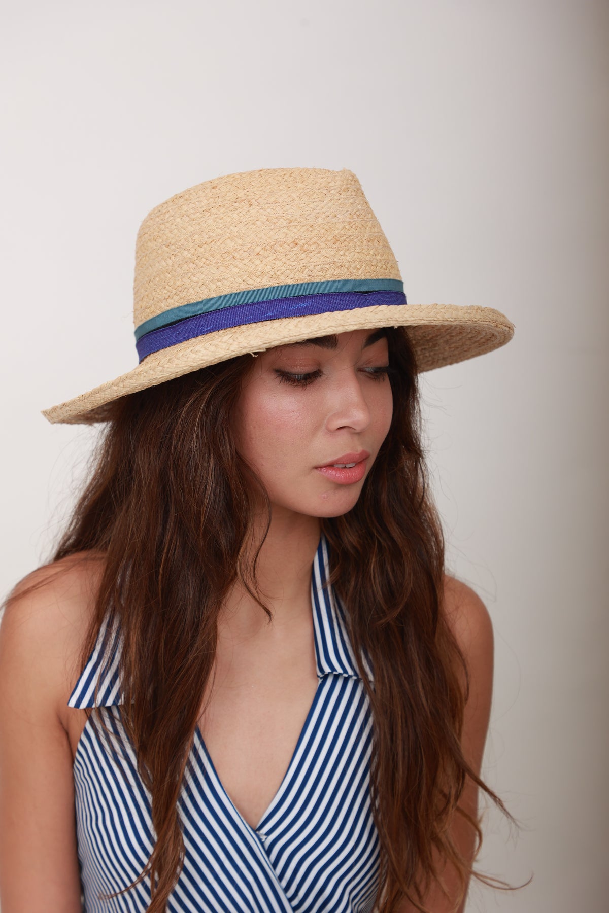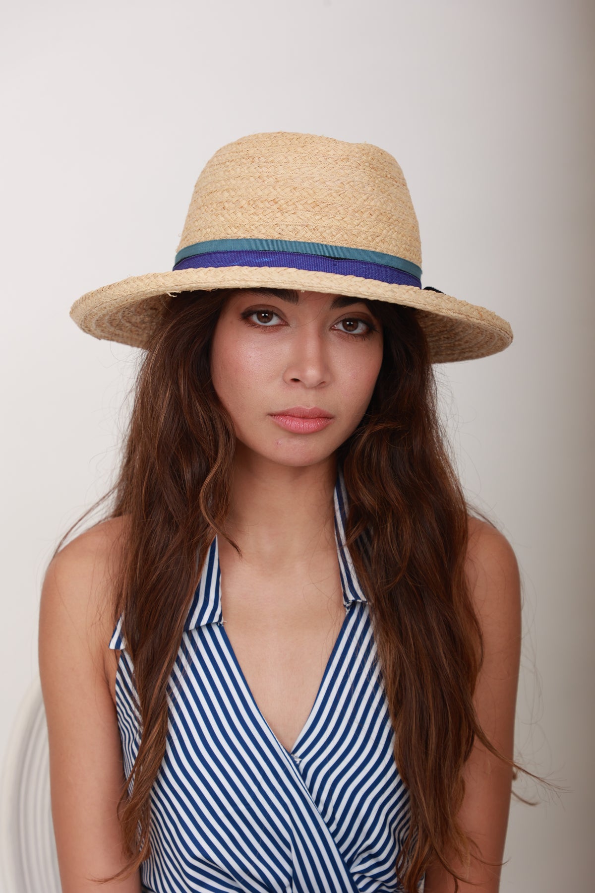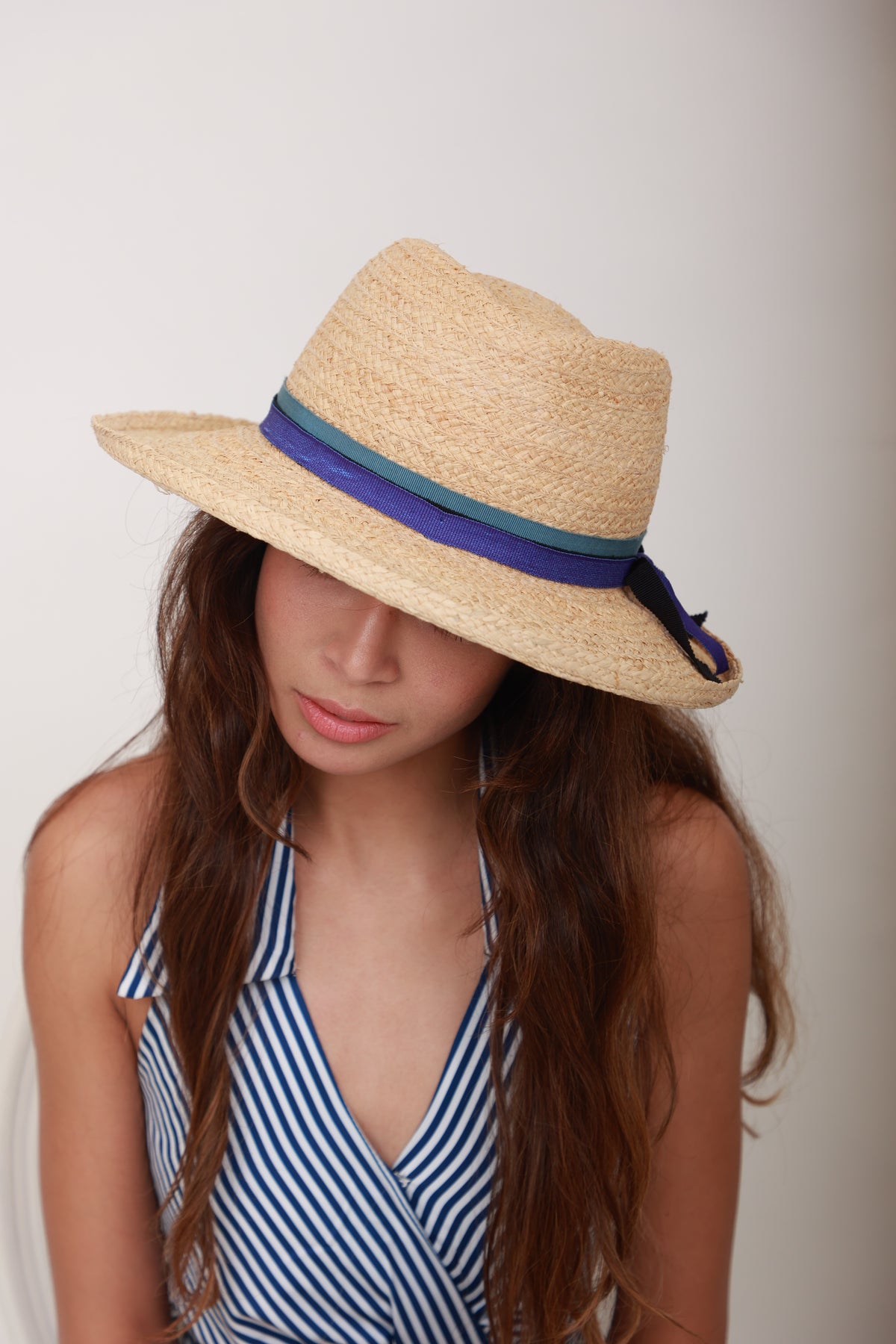 Fedora en raphia naturel avec ruban bleu