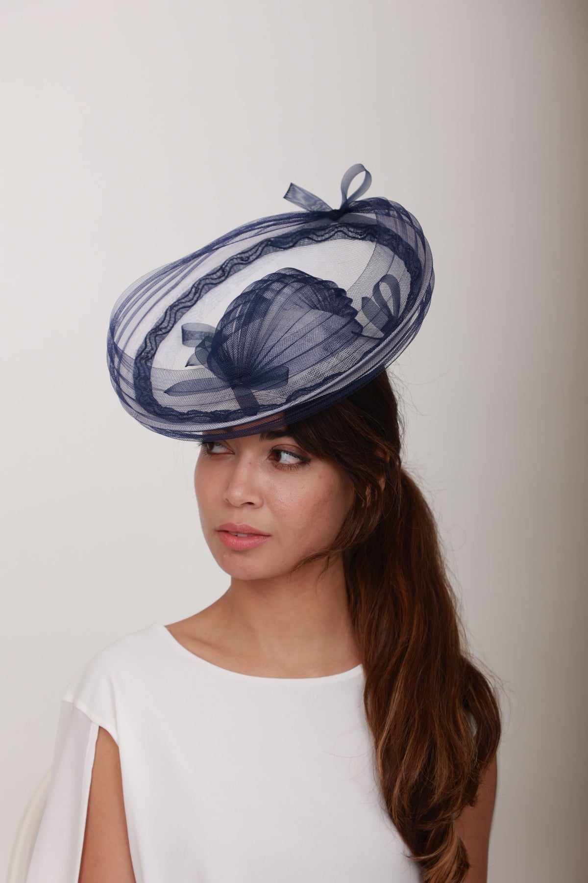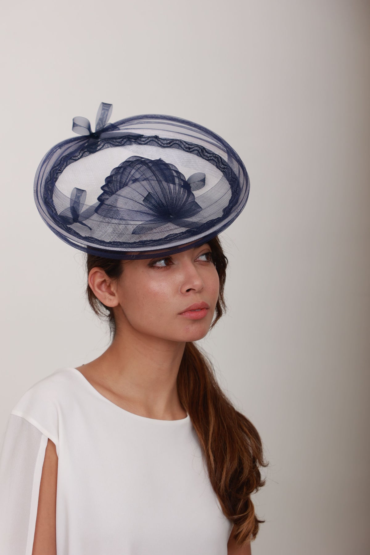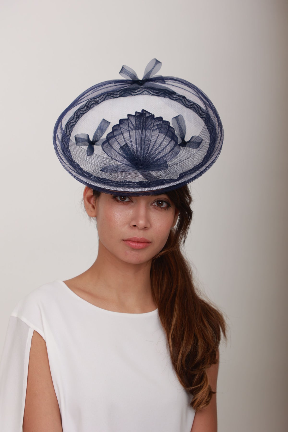 Description : Ce bibi en crin blanc et bleu marine adopte une forme soucoupe délicatement plissée. Bordé de crin bleu marine, il apporte une touche poétique et raffinée à l’ensemble. Maintenu par un fil à chapeau discret posé sous la nuque, il