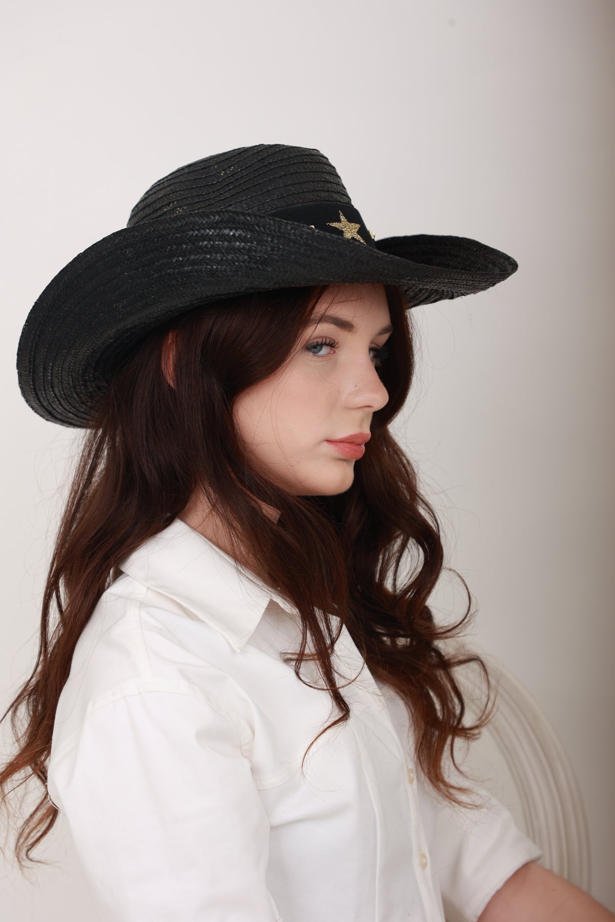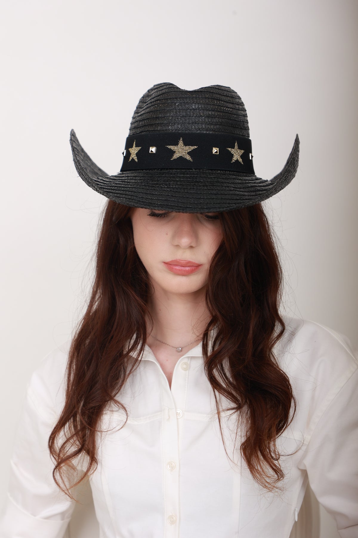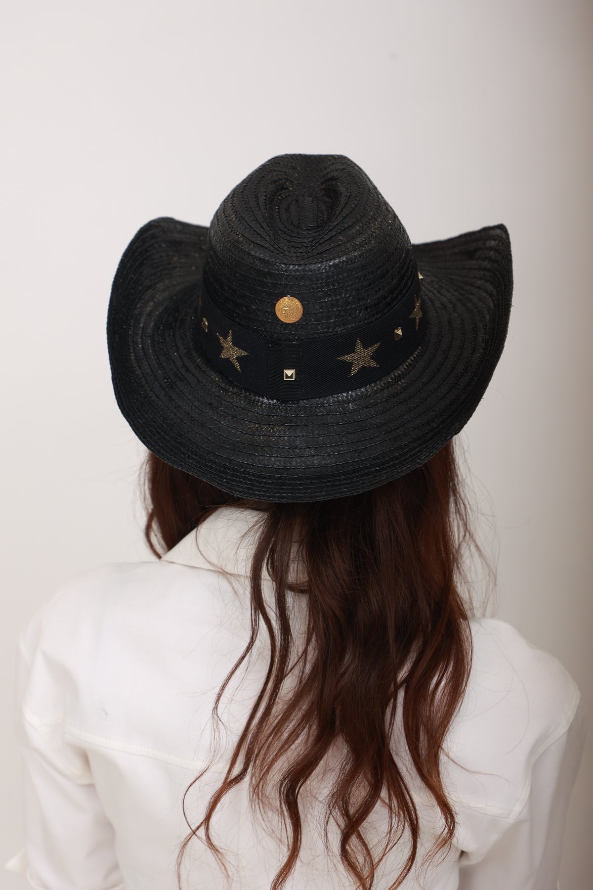 Description : Audacieux et raffiné, le Priscillia est un chapeau texan style cowboy en paille vernissée noire, décoré d’étoiles en métal couleur bronze. Une pièce de caractère qui affirme un style unique et élégant.